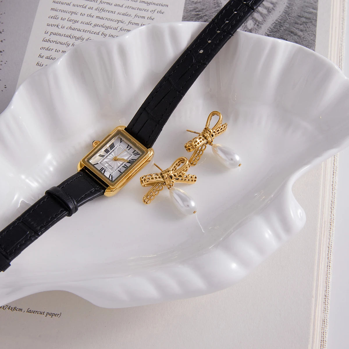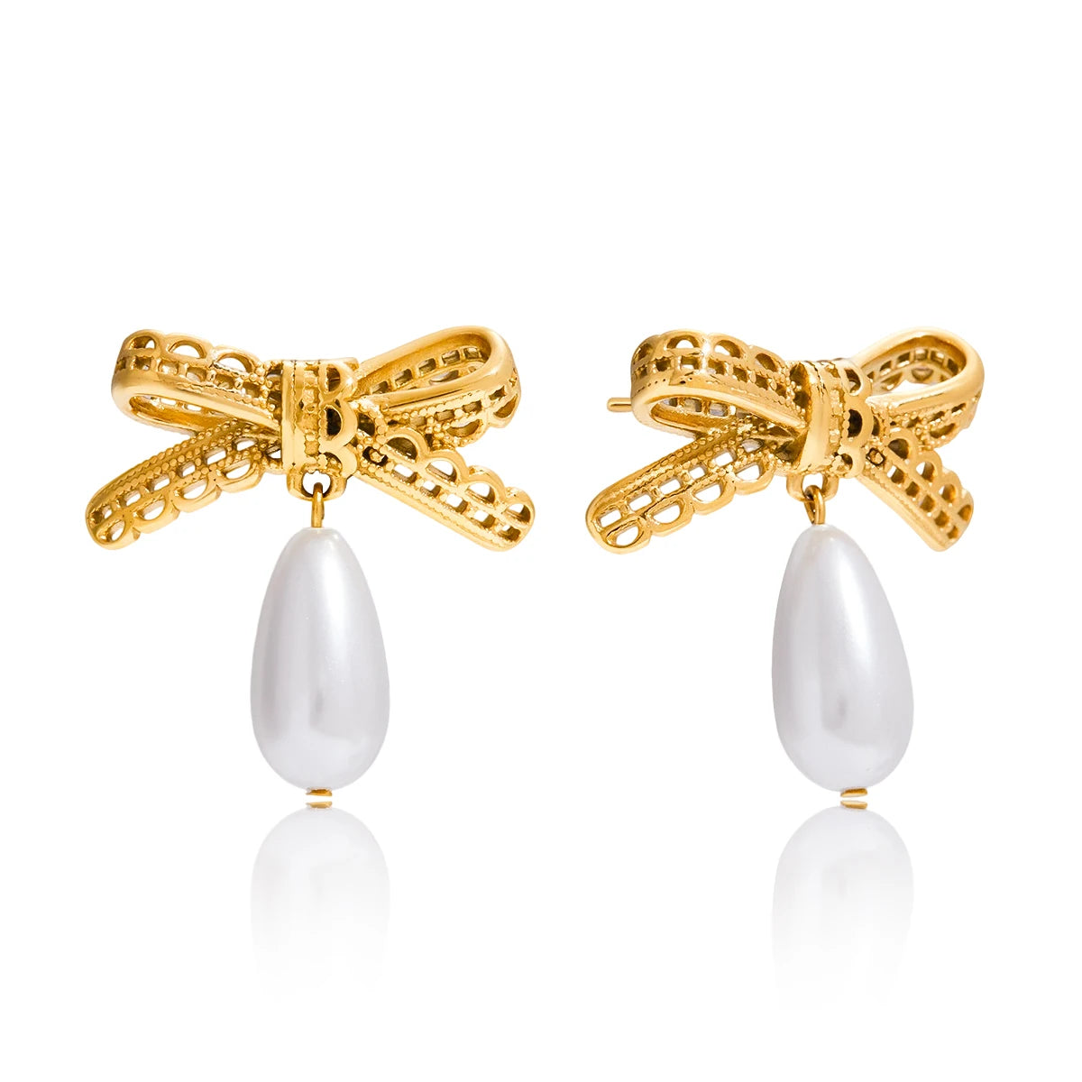 Enhance your look with these elegant imitation pearl drop earrings, designed with a charming bowknot detail for a feminine and refined style. Crafted from high-quality stainless steel with 18K gold plating, these earrings offer lasting shine and comfortable wear. Perfect for weddings, parties, or everyday elegance, they make a beautiful fashion accessory and thoughtful gift for women who love timeless pearl jewelry.